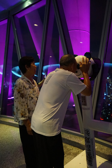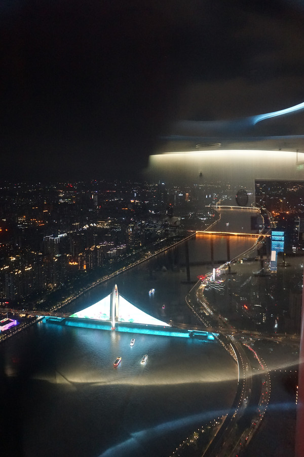 然后,姐们兴致勃勃登广州塔去了,老人小孩打车从酒店出发,售票处集合。人是真多啊,晚上直接封了周边的路供游客走,然后就是漫长的排队等待,先是安检排一次,再是登塔电梯排一次,保守估计一个小时起步,所以我们预约的21:00海心桥,直接报废,光在这排队等吧。但是,看到有些门票直接被引导去了其他电梯口,不知道是不是买了塔上电影票的。乘坐登塔电梯前拍了张照片让塔顶取,十点左右终于成功上来了,就是坐最高的电梯,偶尔能看到五光十色的塔身。出了电梯脑子直接就炸了,这熟悉的儿童吵闹声,这震耳欲聋的分贝,一间两层的密闭的落地窗大房子,竟然没有在地下的时候感觉好看。然后说回那张照片,人工PS个背景,128元。在塔顶拍拍照,溜达溜达等人少了,扫码花钱看了望远镜,就等电梯下来了,差不多刚走出塔底就灭灯了,老人小孩撤退后,本来想去大佛寺再看看,结果搜一下说大佛寺也关灯了,坐公交车转自行车,推着自行车上跨江大桥,凌晨的大桥,偶尔路过的汽车,飘在江面上的游轮,还有耳边的呼哧呼哧声,吭吭一路骑回酒店,疲惫了,休息。