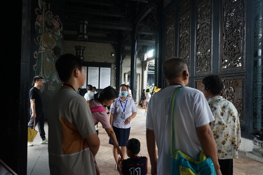 第二天,临时加入登广州塔行程,早起预定广州塔门票,老年人免费门票需要公众号提前很多天预约,当天根本没有票,没办法只能花钱买。今日游览的第一站,陈家祠,据说十分有岭南特点。门票当日可订,服务中心可以免费预约团体讲解,只需要交讲解器押金,最后会退回。差不多20分钟叫一次号,过号不补,所以我们预约之后就一直在大门附近徘徊,本来是40分钟后,结果前一个号没人等待直接过号了。讲解小姐姐非常专业,让我们了解不少岭南文化,同时感受到广州与西方世界的贸易往来确实十分前沿。