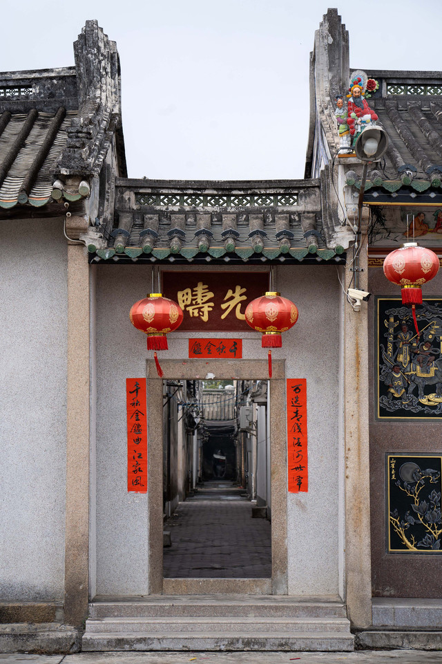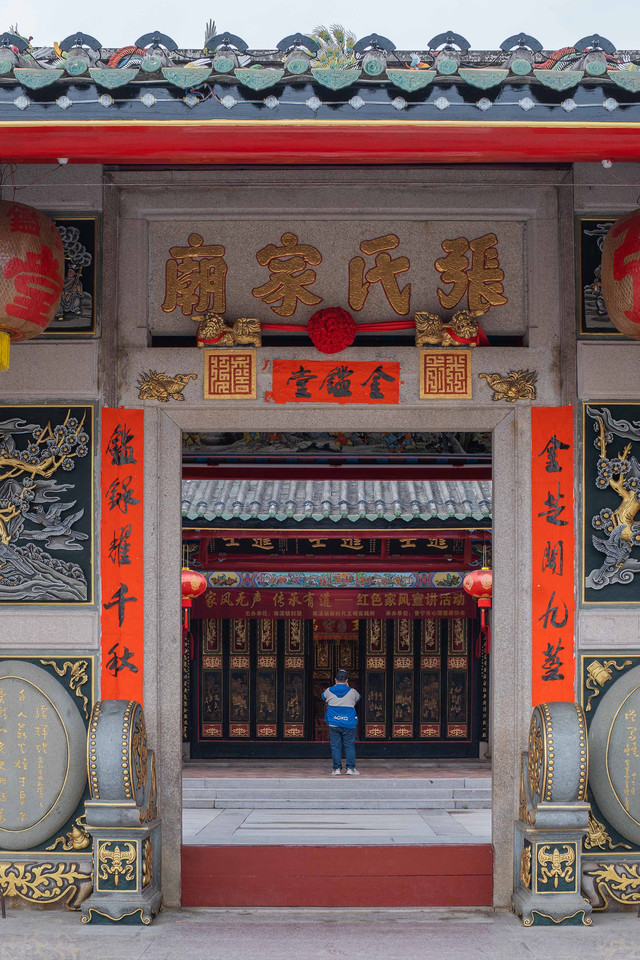 “张氏家庙”设计平衡对称,保持良好通风,主体以祠堂和公室为主,装饰富丽堂皇,充满精美绝伦的嵌瓷、木雕、石雕、彩绘等特色非遗元素。令人啧啧称奇的是,厝局中形成26个“回”字,巨大的规模使其被誉为“岭南第一回形屋”。