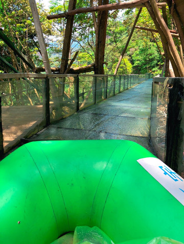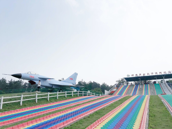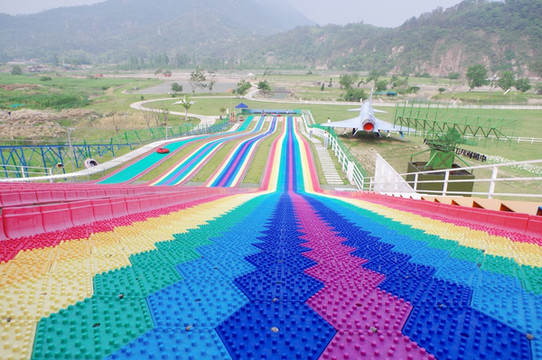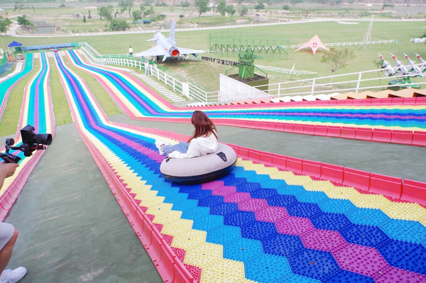 彩虹滑道也是非常的刺激滑到上面淋上肥皂水,你坐着一个充气的圈圈就这样下来了,一路带风带闪电,半路还会给你转个弯,在这里千万不要用手机,自拍帽子的话一般也会被吹飞,还是挺刺激的。