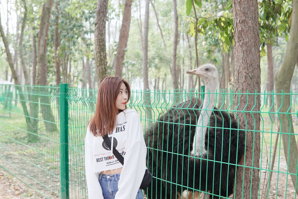 小姐姐跟鸵鸟在对视,唉,比一下谁高。
