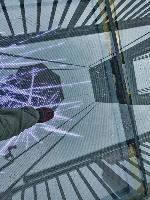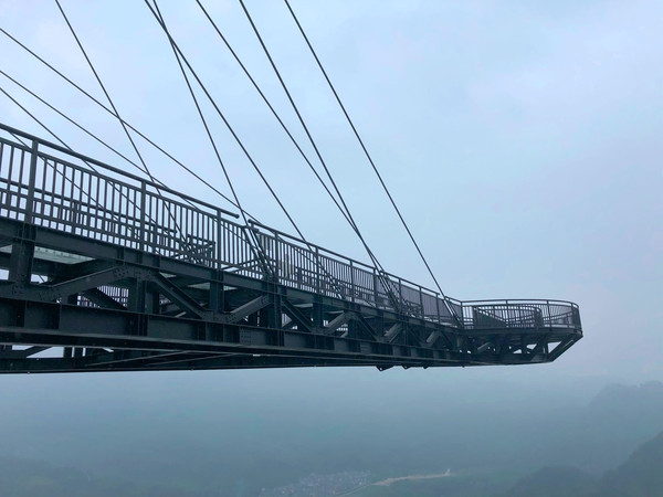 因为下雨玻璃上面引起了很多水珠,当人们过去的时候,水珠被踩掉了,就像下雪了一样,玻璃栈道上流下了一对一对的脚印。阳光明媚的日子,这里一定是非常的好看。边上还有专业为你拍照的,不过现在的人大部分都有自己用手机来拍摄,所以他这边生意也并不是很好。手机工业的发达带来了相机业的衰退,不管是他个人还是相机行业,压力重重。