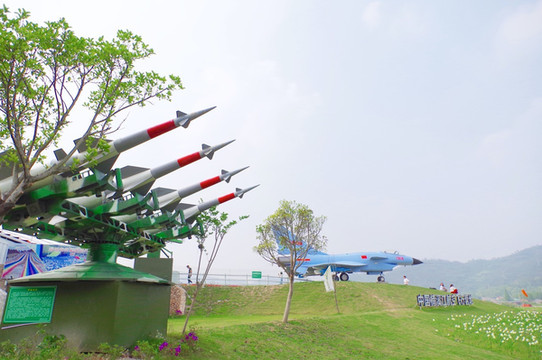 远处的是中国自行研发的歼10飞机模型,远看的就像一架退役的飞机,近处的导弹是萨姆导弹,应该是地空导弹吧。