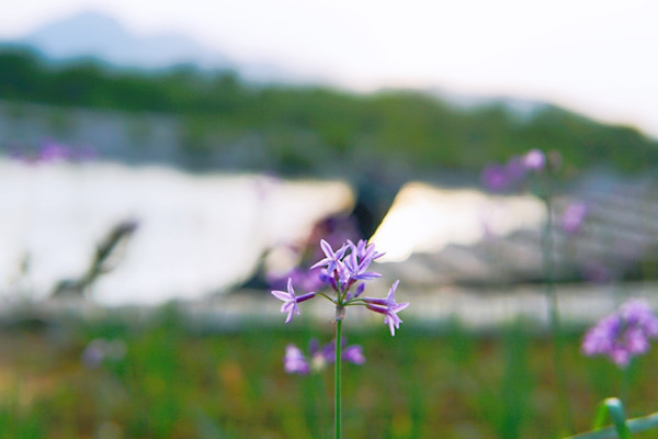 沿途的风景也是非常的美,夕阳下一些小花在南溪江的边上绽放,鹅卵石滩上面还堆放着许多竹筏。