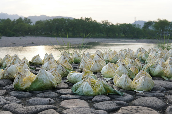 远处看着像是花,近看不是花,原来是大妈在做的咸菜,这应该是包心菜切成了4份,正在晾晒呢?这么多堆在一起也是相当的好看。