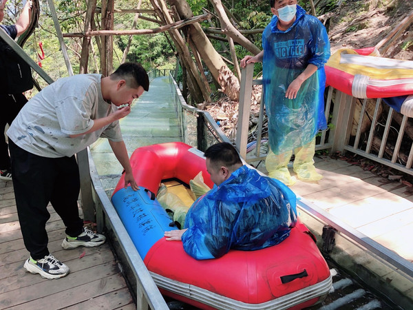 好的,我们爬到了半山腰,这里可以正儿八经的开始在玻璃滑道上滑水了,每个人是100块,雨披需要单独购买,提醒一下这个道非常的刺激,特别是转弯的时候,雨披一定要穿好系紧。像我们穿着这个雨披滑下去,手机差点飞出去,到了终点以后全身都已经湿透了,所以滑前面最好有备用的衣服。省得像我一样撅着屁股晒太阳。
