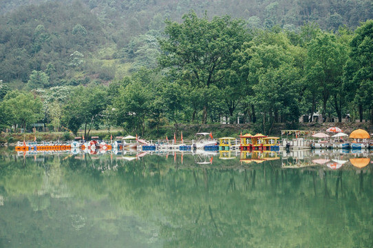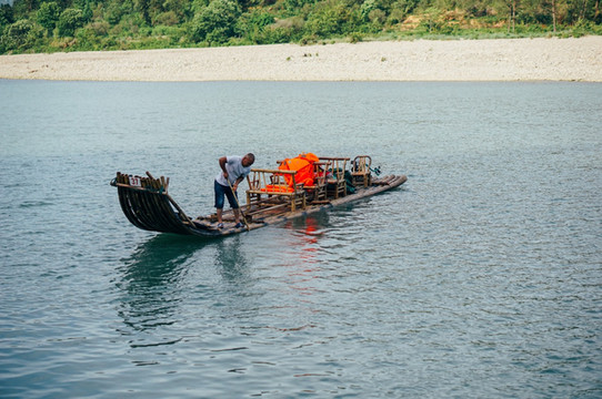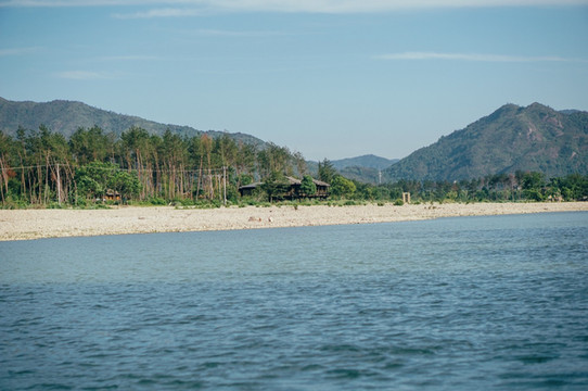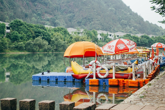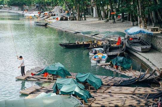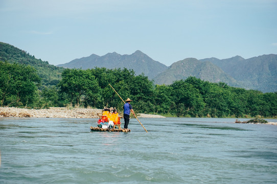泛舟坐筏漂游江上,远眺绵绵青山,近看郁郁滩林,欣赏碧蓝江水,饱览溪光山色,令人心旷神怡。