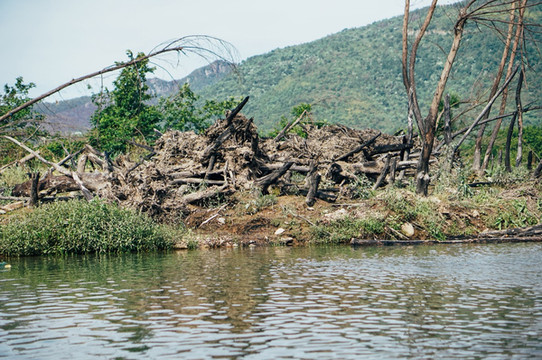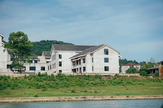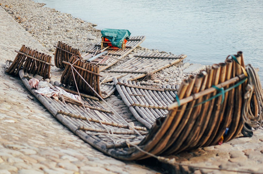 溪边有很多废弃了的竹筏,摆放在这里,也是另一种感觉,黄昏的光线很美,江上泛着粼粼波光,很舒服。