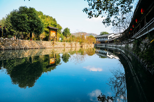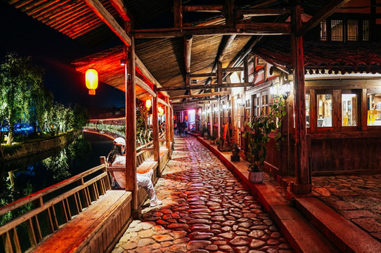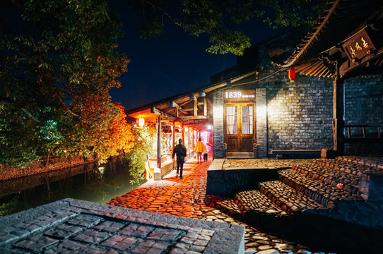 旧时90余间店面与长廊相连,长廊依水而建,如今,古街依然保持着当初的模样,只是商业化却没那么重,廊下挂着一个个红灯笼,和参天的古树绿影相向。