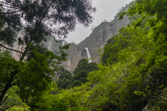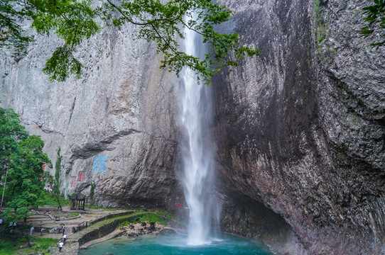 我们一直来到中折瀑,近看瀑布落差一百二十米。周围危崖峭壁,瀑壁下面为半圆形大洞穴,飞瀑从洞顶倾泻而下,水流飘忽,造成飞瀑由顶端抛掷之势,蔚为壮观,潭水清澈,鱼儿游曳,沿潭有环形石路,脚踩卵石,直通中间环岛。还可绕到瀑后,观看水帘,远处的山景隐约可见。