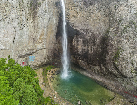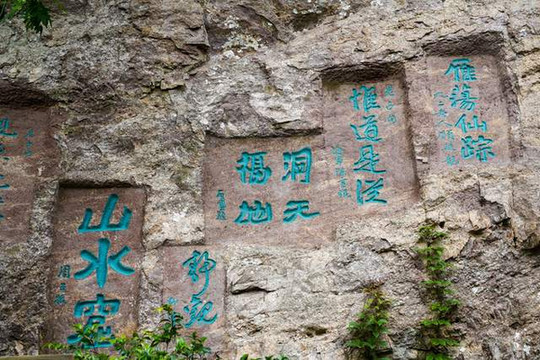 一侧石壁刻有红色字体“雁山第一胜景”,此外还有郭沫若先生赋诗墨宝:“奇峰传百二,大小有龙湫。我爱中折瀑,珠帘掩翠楼……”仰视洞顶,崖端珠玑纷落,当空回旋,日光折射,七彩缤纷,景色格外绚丽。