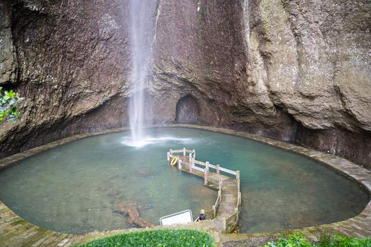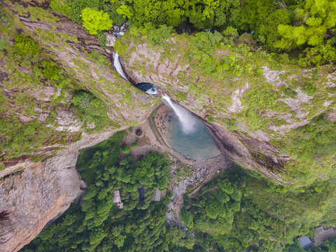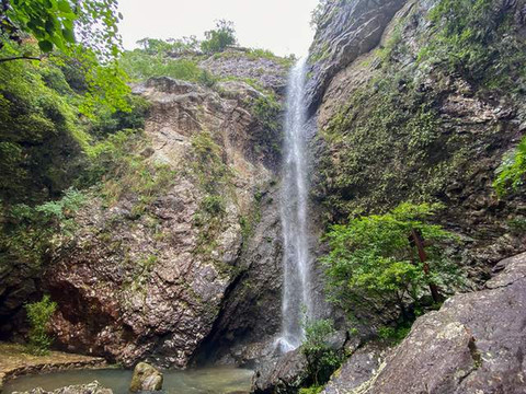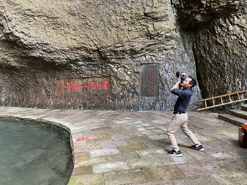 此次时间有限,不能再上去欣赏上折瀑的雄伟,下山来到了“下折瀑”,该景呈葫芦形悬崖峭壁,落差五十米,仰视上去,细小的水帘如银丝飘落,飞瀑而下,瀑与天空相交,形如葫芦,所以下折瀑又名“葫芦天”。下面圆形池潭,一泓清洌。吹过了山风,也观过了瀑布秀丽,再步行至左侧朝西的龙游洞里一探究竟。