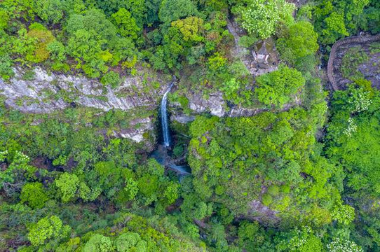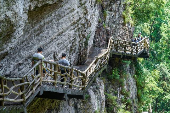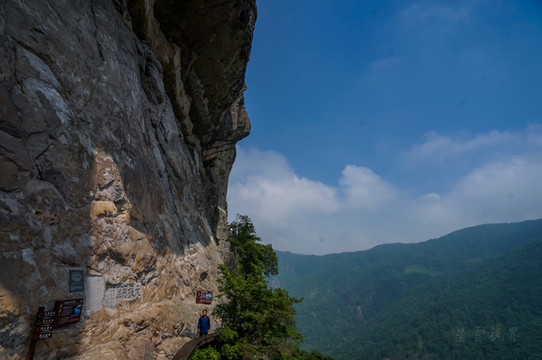 从小龙湫出来,左侧上行便是卧龙谷,景色更见清幽。台阶依附崖壁攀援而上,不时有泉水拂过头顶。快到独秀峰时,眼前有一段长长的玻璃栈道,走过玻璃栈道,便到了断肠崖。