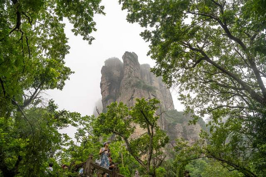 站在瑶台之上远看群峰,山外有山,谷中有谷,无峰不奇,无石不怪。每一个山峰都寓意着一种不同风格之美。纵观灵峰美景,山道弯弯,穿行于溪谷间,高高的崖壁在两旁俊俏地挺立着。顺山道前行,旖旎的群峰迎面联翩而来。群峰遥相呼应,随着视觉移转,或回首顾盼,或招手欲语。随着高度视角的变化,黛青的山峦与油绿的树林远近变位,俯仰换姿,进一步凸显出雁荡山移步换景的特色。