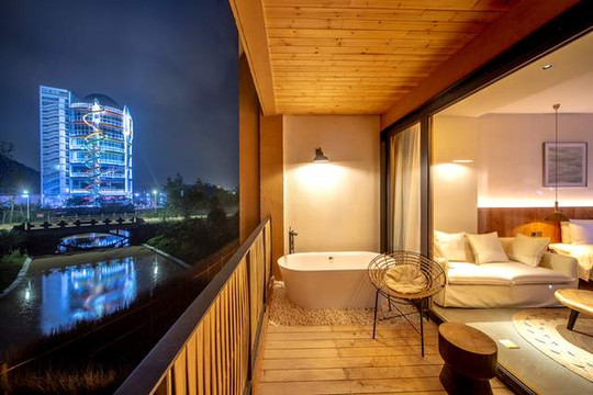 这里是田园里的一方静谧小天地,沿溪而建,依山而建,远处有山,近处是水。简约的木质装修,透露着自然的味道,高品质的室内用品,是乡村野趣和高级情调的完美结合。