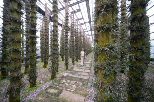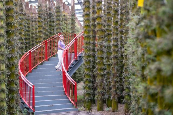 在铁皮石斛文化园看到占地200亩的亚洲最大“石斛森林”,大棚内,近3000棵高大的杉树依次排开,形成一个立体种植矩阵,铁皮石斛就长在杉树干上。