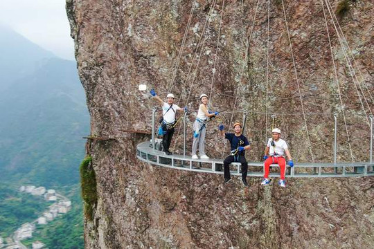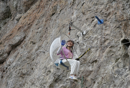 穿戴上安全设备后,教练给做了简单的操作示范。随后,我们踩着脚踏抓着钢扶手,迈着小步子开始行走。起先的两步,还算是轻松,厚实的脚踏给了我们不少的安全感。崖壁看着也越来越陡峭,心中开始有些恐惧,但是,远处的风光仿佛又有一种神奇的魔力,吸引着我们勇往直前、攀登高峰。