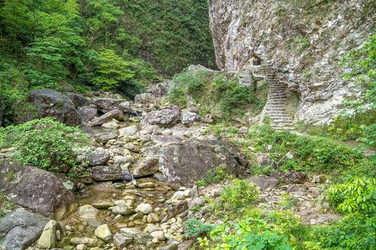 卧龙谷位于小龙湫背上,俗称石船坑。谷内高爽清幽,奇景罗列,飞尘不到,恍若隔世。通过一条依嶂壁修造的栈道,前面即是龙口湖,溪水清冽碧绿,很有一番世外桃源的味道。