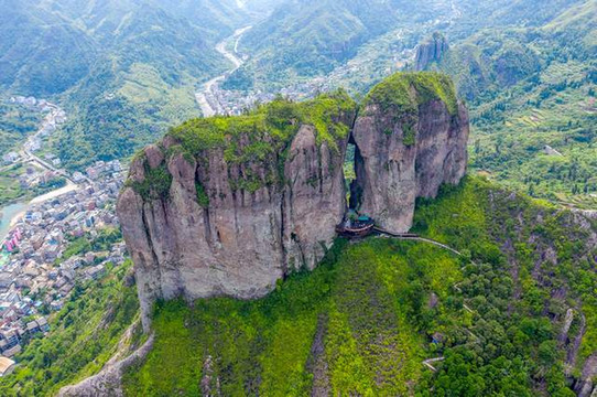 沓屏峰是一顶冠状的岩峰,高约百丈,当地人称其为“百丈岩”,它由前后两峰构成,前峰赤色、形如春笋,后峰白色、高耸入云,中露空隙似天门,故又名双岩门。沓屏峰岩壁裸露程度高,适合攀岩。若是登上山峰,极目远眺,目之所及是独一无二的雁荡山景色。
