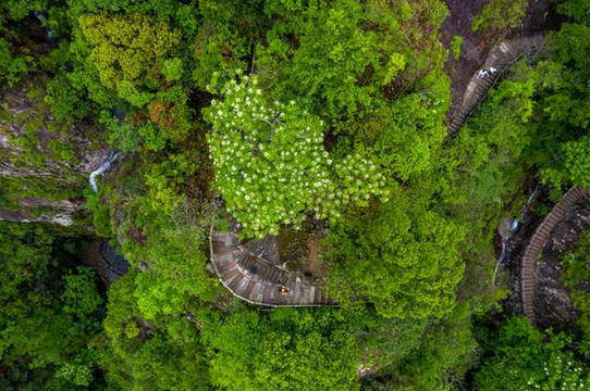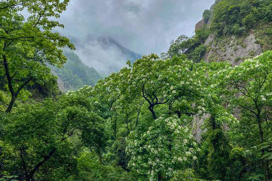 进入景区,我们踩着脚底下的云麻石砌成的一米多宽的台阶,手扶栏杆开始向上爬山,山路蜿蜒曲折,山坡上,沟底下树木葱郁,现在正是雁荡山油桐树开花的季节,千年桐树竞相开放,如同白色的火焰,美得令人有些感到窒息。缓步于高山栈道之上,近看悬崖异洞林立,远眺是如玉雕一般的团团白云,淡雅的花香随风飘来,不俗不媚。