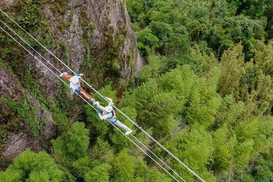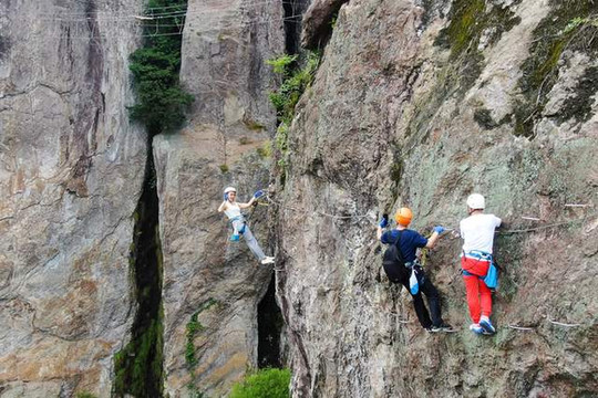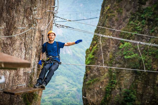 项目根据挑战的难度及线路的长短,适应不同游客来体验,主要分为A、B、C三条攀爬路线。A线长423米,起步就是垂直攀爬,适合体能和毅力都非常好的游客去挑战。相较于A线,长900米起步平缓的B线则显得更为大众化,由于没有过于专业的技术要求,游客可以在欣赏美景的同时顺便满足一下自己的攀岩梦想,中途有许多网红打卡点可以拍照留念。如果你对前面两条线路难以抉择,也不用担心,可以在仅有70米的C线试玩一下再做选择。