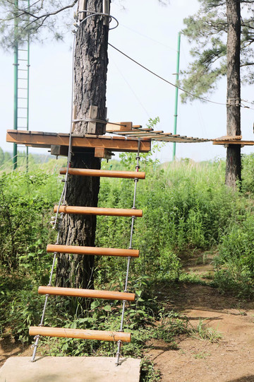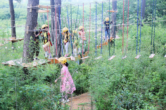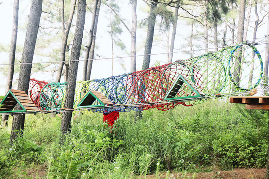 接近大自然本就让人兴奋,悬空桥梁、秋千道、蜘蛛网、隧道穿越、高空吊环,丰富多彩的障碍关卡,是挑战更是无穷的趣味。这里设计了两条线路进行挑战,一条可以给小朋友磨练意志,另一条则可以给大朋友增进感情。