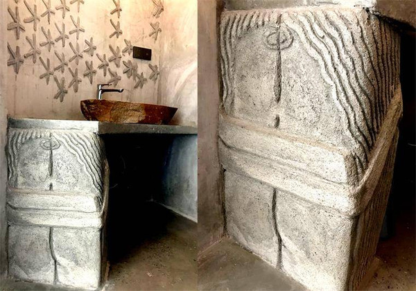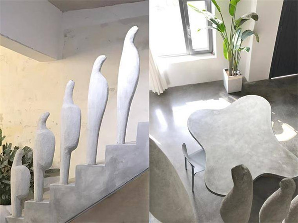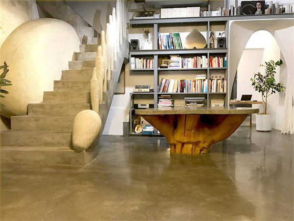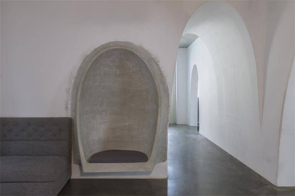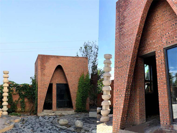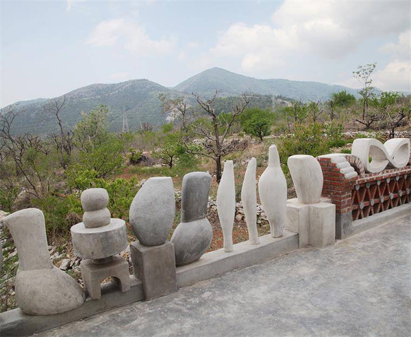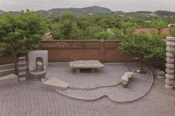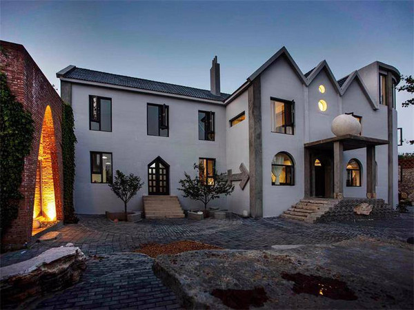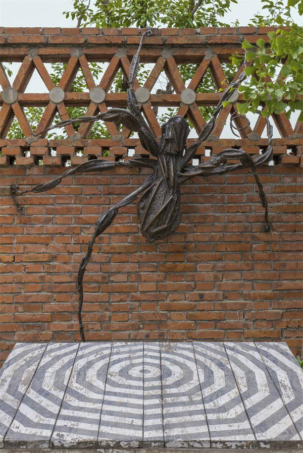 艺术馆院落有叠层石石桌,蛋形装置洗手池、龙溪流水及鱼池,七脚蜘蛛、蛛网茶台及独特的中餐厨房等,随处可见的装饰景观和艺术作品可谓这一空间的灵魂。