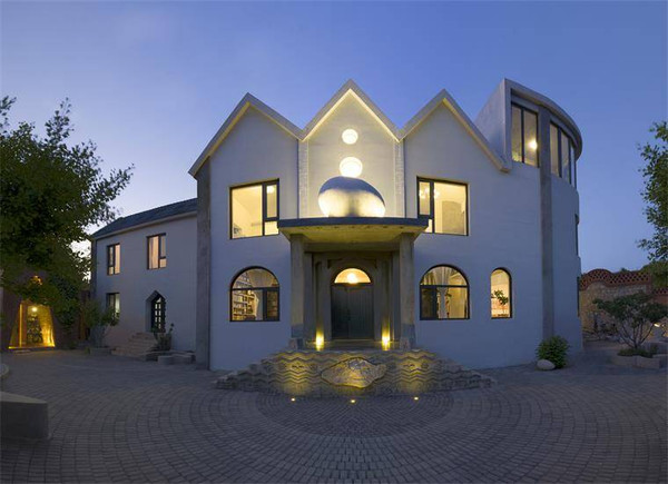 艺术主体建筑的东侧做的是半圆造型,全透明落地开窗设计,客人可180°环山而观,建筑的中间部分做了三个山峰的造型,是与后面高低起伏的山脉相呼应,中间二楼做的两个圆形灯光设计和前露台的鸡蛋雕塑相互呼应,以突出艺术馆的文化主题。