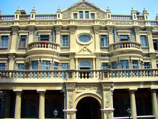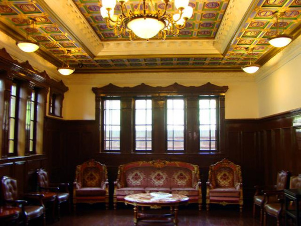 一楼正面辟门三处,中为半圆形上亮过道门,两侧为半圆形群体组合门。正是二楼平台与三楼的两个突出半圆体阳台。都是水泥花格,上曲装饰三角纹,半圆形,瓶式栏板,廊柱,圆形柱头等。楼内所有的办公室、客厅、会议室、起居室等都保存的相当完好。