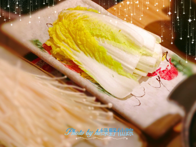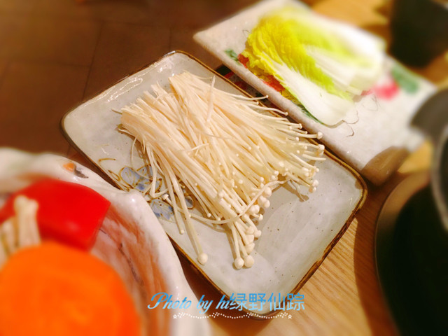 「蔬菜拼盘」花菇、茼蒿、大白菜、胡萝卜片、金针菇,种类蛮多的。