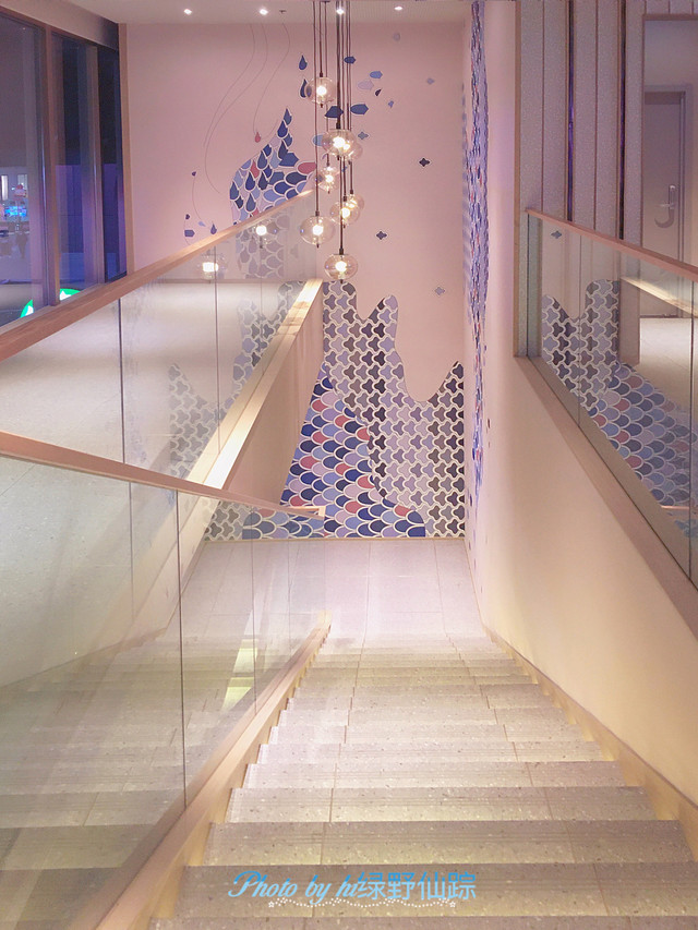 无论是白天的景色还是夜晚的景色,真的都太美了!室内两层楼,浅色系为主,特别明亮。一楼和二楼之间,有一个浅色系的大理石网红楼梯,很多人在这里拍照打卡,墙上从白色到蓝色渐变的美人鱼鳞片,波光粼粼,十分耀眼。二楼的面积更大,功能区更多,墙上的小木板每一个都可以翻转,会拼成四至五幅不同的画。