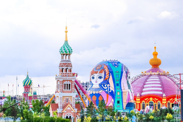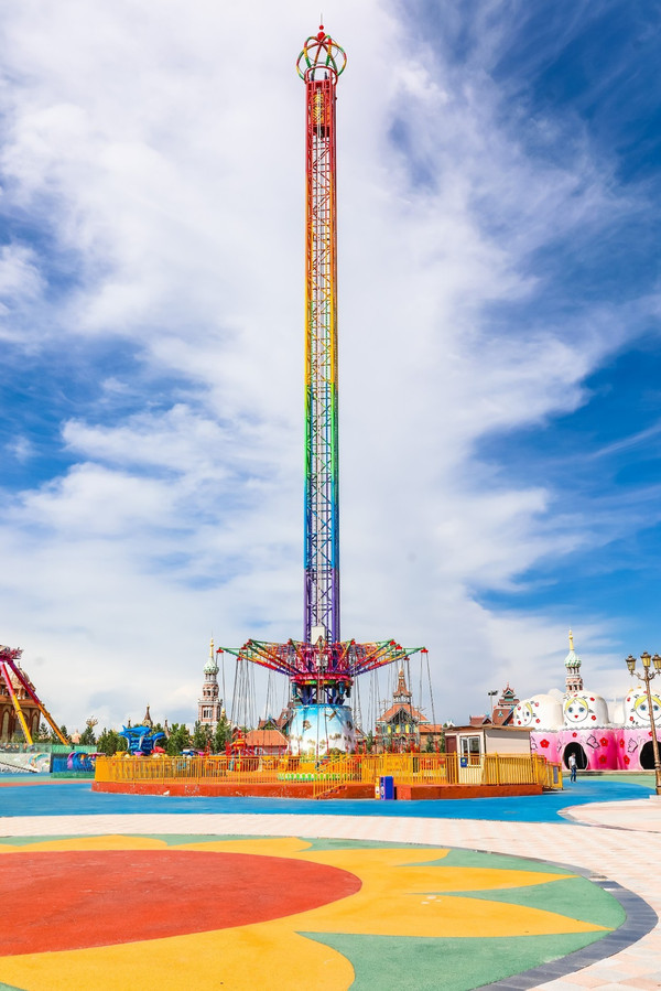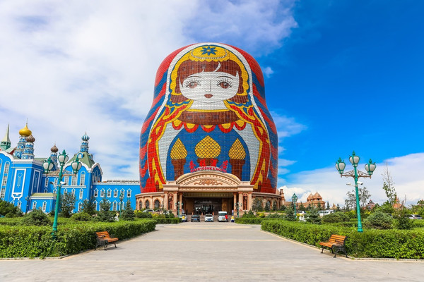 吃过午餐,我们直接进入套娃景区,这个地方,如果带我家小姑娘来,她一定很高兴。一水的像童话一样的建筑,门口以莫斯科红场为建筑元素的入口,进到里面各种各样的套娃,各种俄罗斯民俗体验馆,各种手工艺品直营店,还有各种大大小小的游乐设施,各种色彩艳丽的布置,这里,约等于一个小型的迪士尼。