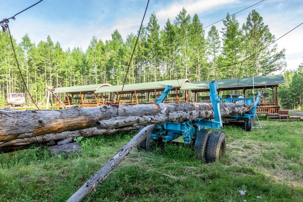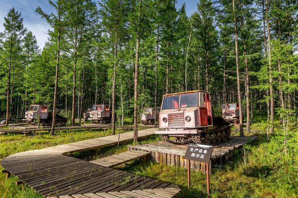 林区附近停靠着很多拖拉机和施工机器,这些机器当年都是永远运输木材和采伐木材用的, 随着大兴安岭的停伐,这些机器也随之退休留在林区,当做纪念。