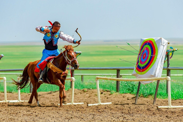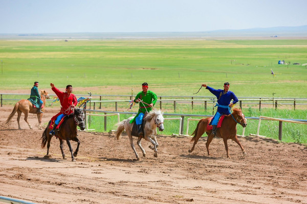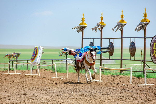 蒙古人骑马方式很多种,这些特技表演吸引台前阵阵掌声。马后藏人,这个应用于战争时期,人以马为掩体,出其不备,一招制敌。