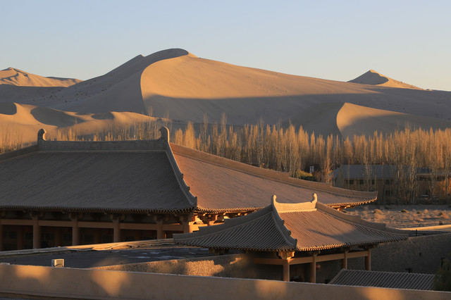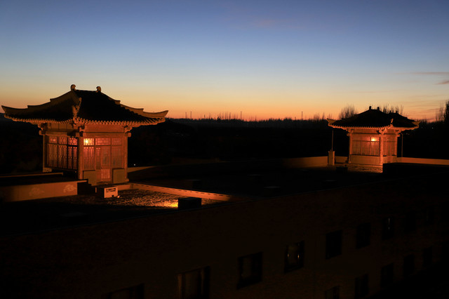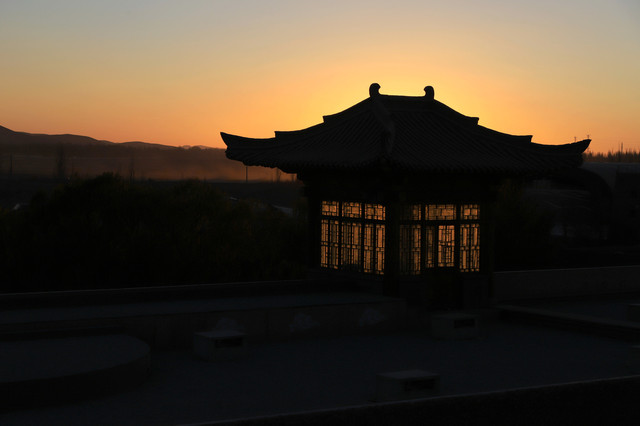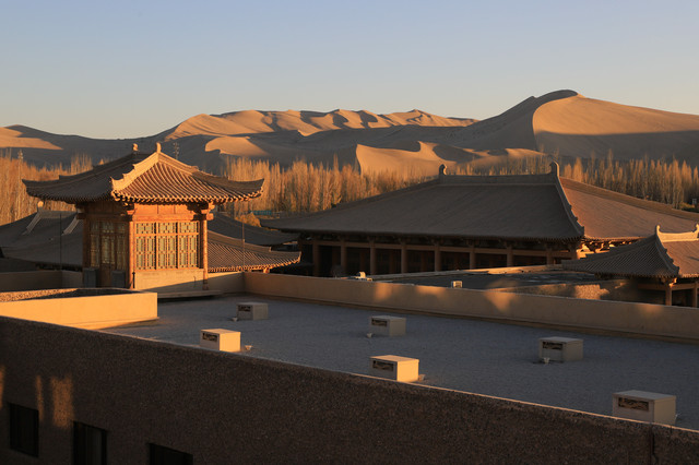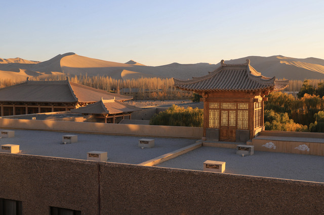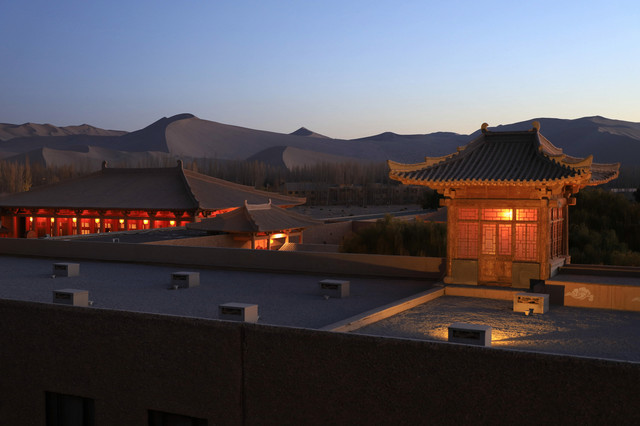 傍晚时分,去了只有一条马路相隔的敦煌山庄,敦煌山庄的摘星阁可是名声在外,是观赏鸣沙山日落的好地方
