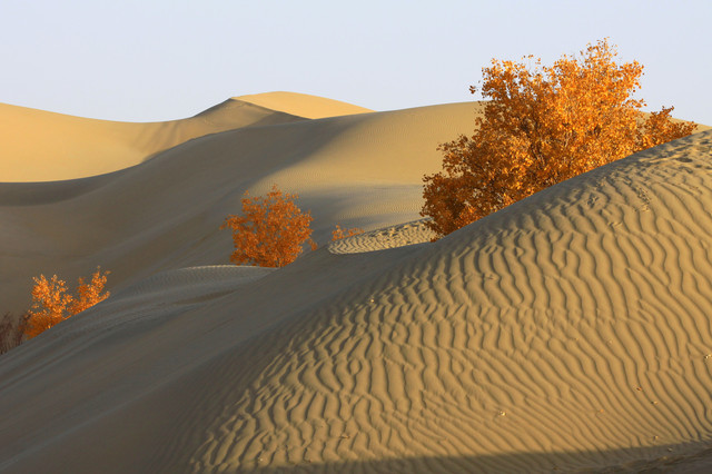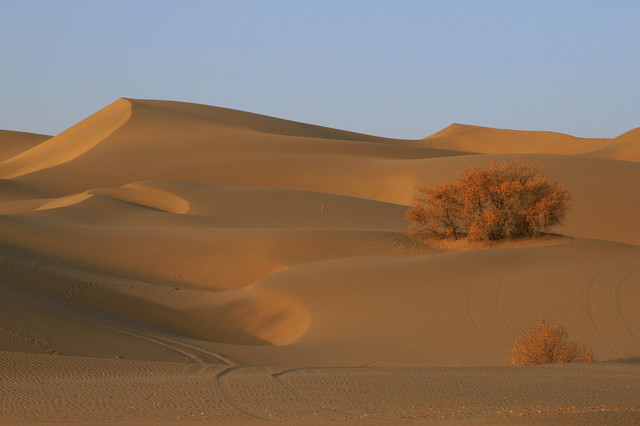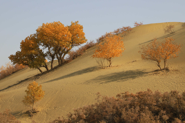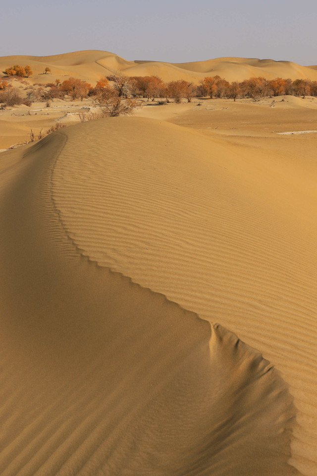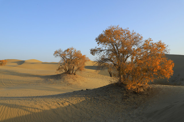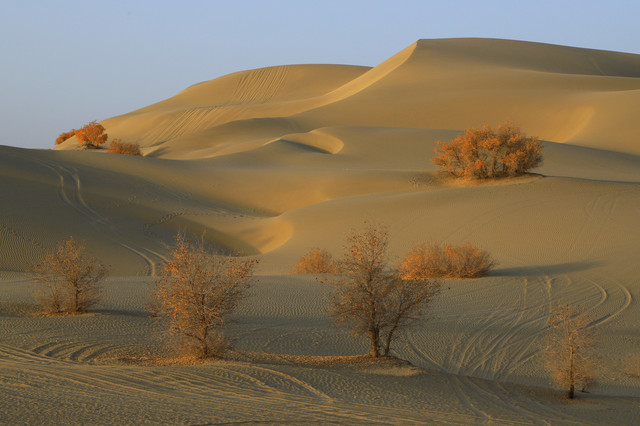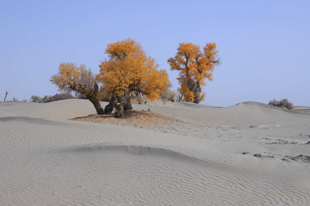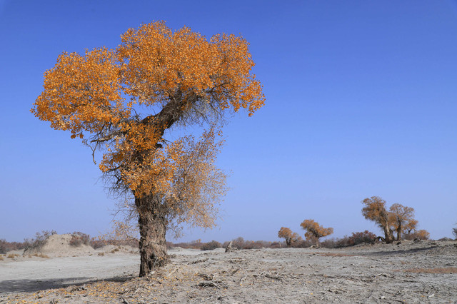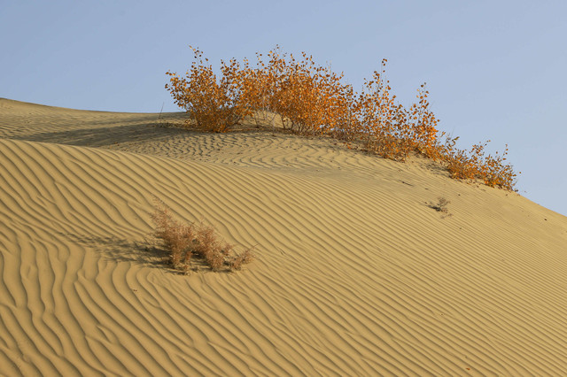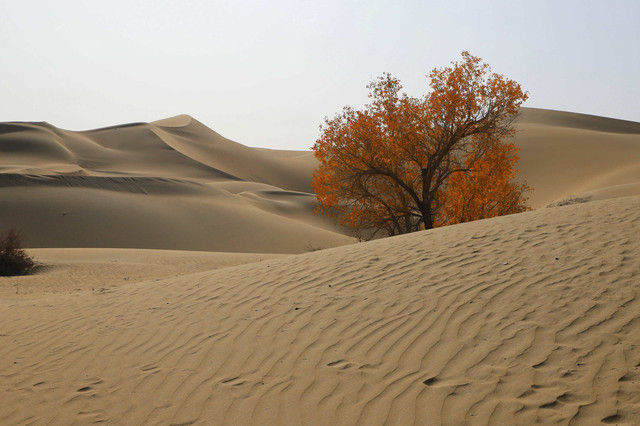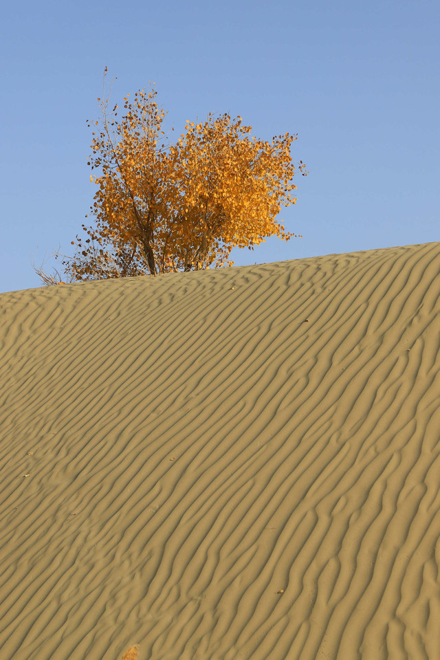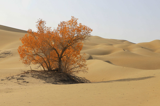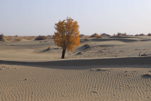 车辆行驶在一眼望不到边的塔克拉玛干沙漠腹地,沙漠中的胡杨,是那么的孤傲和挺拔,它耐寒、耐旱、耐盐碱、抗风沙,千万年来,顽强的生存繁衍于沙漠之中,它无愧于“沙漠英雄树”的称号