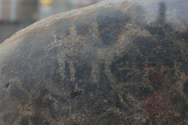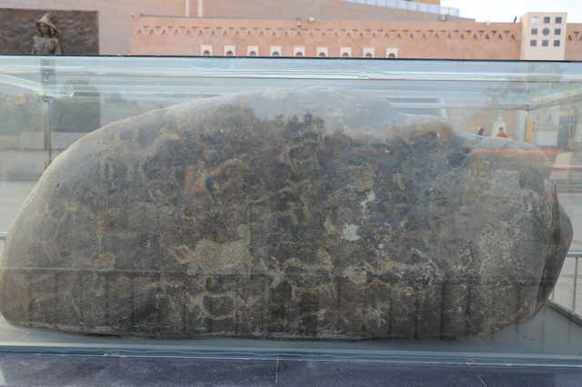 在博物馆的前方,有一块巨大的用玻璃罩罩起来的岩石,这就是若羌岩画