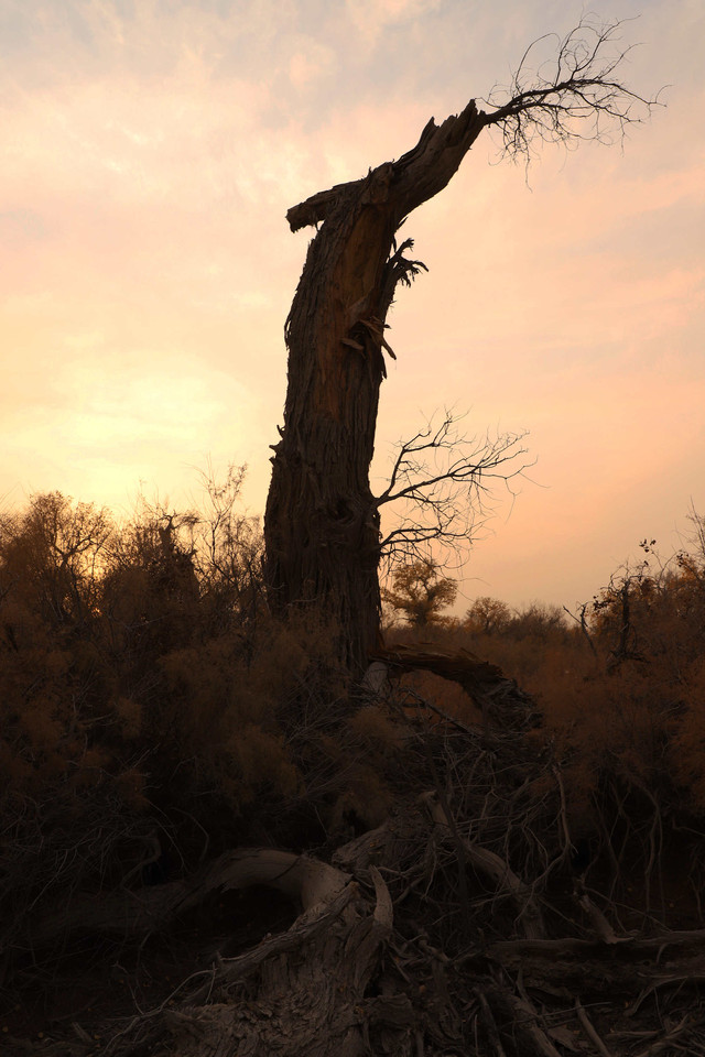 早上,随着越野车进入塔里木河腹地,在塔克拉玛干沙漠边缘,寻找不为外界所知的33团胡杨林,这里的胡杨原始而又狂野