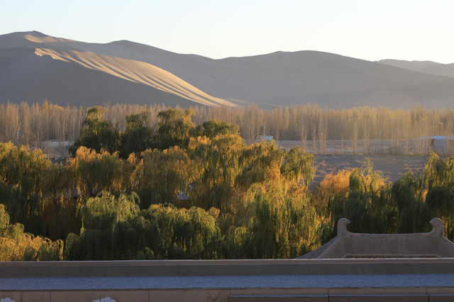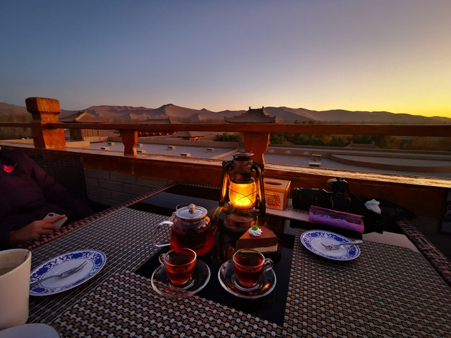 就这样,我们喝着茶,静静的看着眼前的鸣沙山,静静的看着太阳慢慢下沉,给大地披上一层金色。