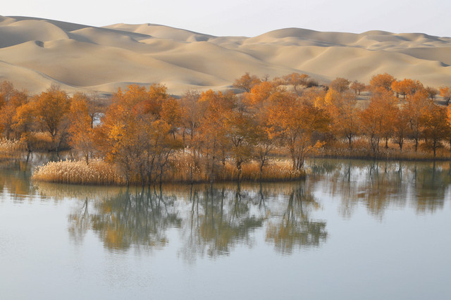 新疆尉犁县的葫芦岛,是塔里木河横穿沙漠,在下游的一个弯道处。从空中鸟瞰,因其水域像个葫芦而得名。