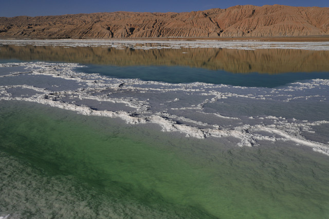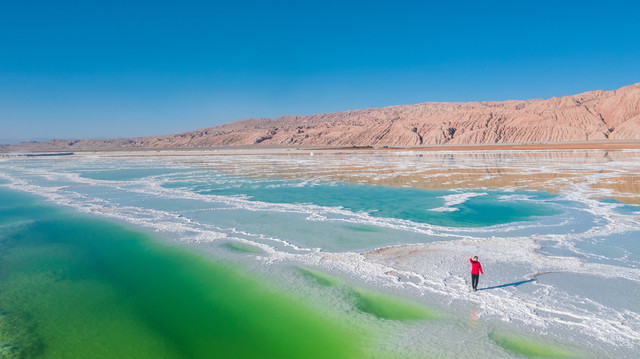 这里其实是一个盐矿工地,因为湖中盛产硼、锂、盐、钾肥、芒硝等元素,使得湖水呈现出碧绿、宝蓝等的颜色,茫崖翡翠湖的颜色纯美剔透,如同镶嵌在戈壁的璞玉,一跃成为新的“天空之镜”