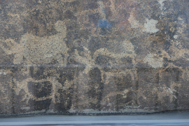 若羌岩画,发现于若羌县境内东南约200多公里的阿尔金山上,此块岩石呈不规则的椭圆形,重约4吨。岩画用粗犷的线条,简单勾勒出野牦牛、藏羚羊、野骆驼等野生动物的形态,历经数千年的日晒雨淋、风沙侵蚀,画面依然清晰可见、生动传神,展现了古代先民的审美观和绘画技艺,反映了早期居民的生产、生活的美好画卷。