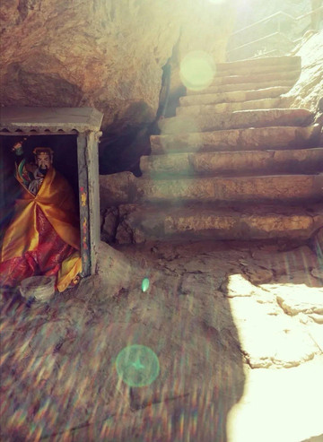 再往上爬,来到了峻极宫,高台两进院落中有数孔石洞,房舍五间,其中供奉着无极老母的雕塑。