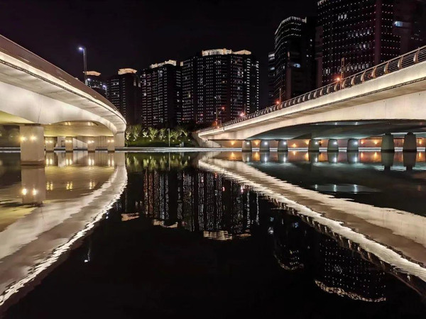白天可以沿着环湖栈道观赏湖中的游鱼,湖岸边林木成荫,建筑飘逸流动,清澈的湖水倒映着鳞次栉比的高层楼群,景色令人心醉。