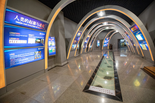 博物馆的主色调为灰色,清水砖搭配灰色墙壁,营造出浓浓的现代科技感,半圆形的环灯设计碰撞出一丝工业风,让人不由得感叹设计师的独具匠心。沿着长廊缓缓前进,四周的墙壁陈列一幅幅生动画面,绘声绘色,将人类的起源与进化娓娓道来,瞬间增添了几分博物馆本该有的书香气息。