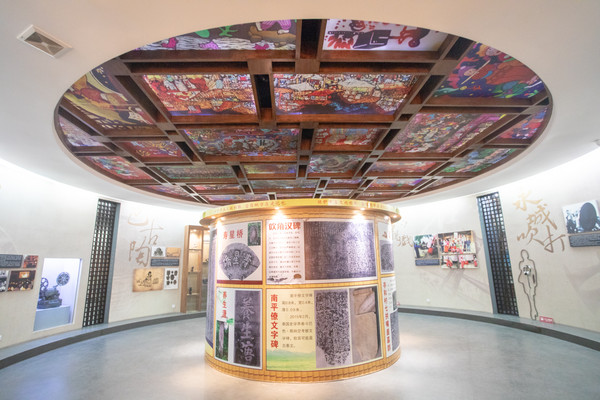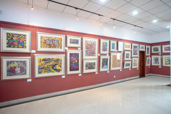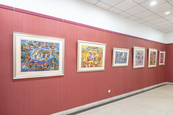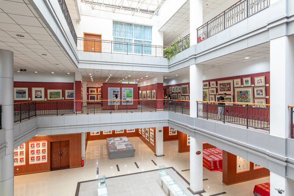 綦江农民版画院一共分为4层,一楼是艺术展厅,运气好的话,可以邂逅精彩纷呈的艺术展览。暗红色的墙壁纹路分明,质感十足,一幅幅风格迥异的农民版画相互拼错,让人目不转睛,这些版画色彩明亮,手法大胆,风格抽象,一不小心就能将你带入一个奇幻的多次元世界。