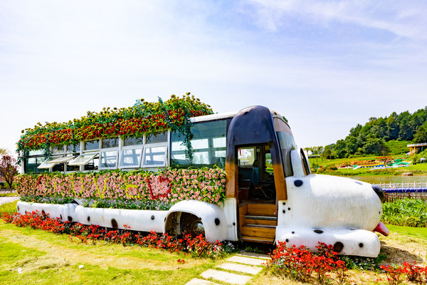 蓝天白云下,一座少女心十足的鲜花车矗立在青青草地上,车身环绕着数不尽的香槟玫瑰,还有向阳而生的向日葵,车头的造型憨态可掬,浪漫中略带一丝俏皮,让人叹为观止,我想这大概就是一辆通往幸福大门的爱情列车吧!对于爱拍照的女孩来说,这里绝对是一座得天独厚的背景墙,随意凹造型,方寸间定格唯美瞬间。