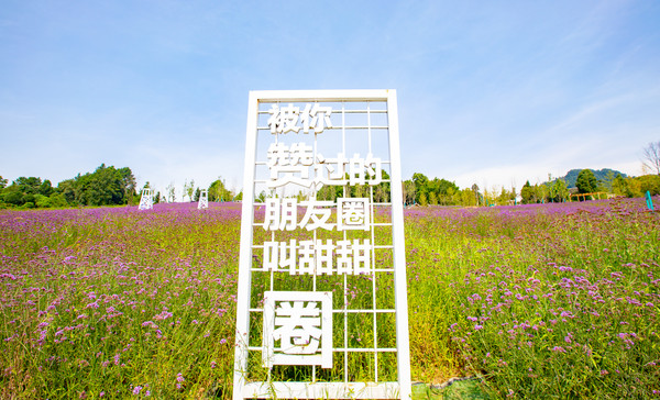 沿着道路缓缓前进,七月的綦江似乎并没有想象中热,偶有清风徐来,夹杂着花香,将最后一丝热意吹散。道路旁时不时出现夺人眼球的雕塑,如“我在花仙谷等你”,以身后的马鞭草花海为礼,向游人发出最后的请柬。