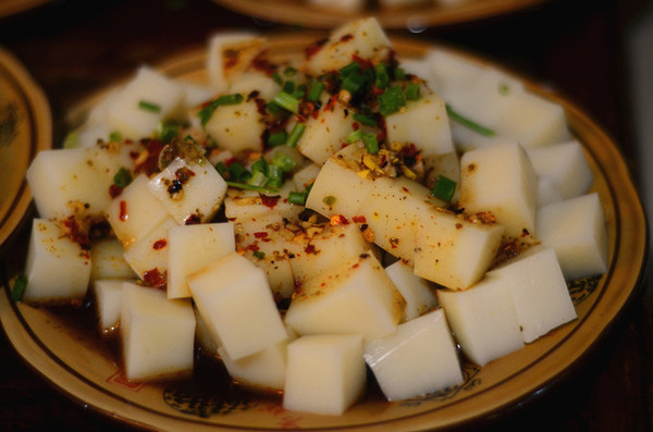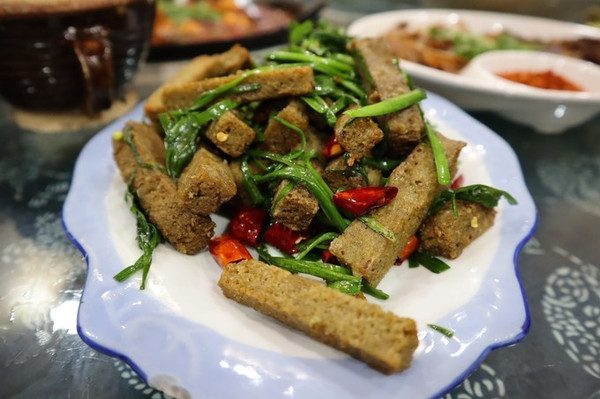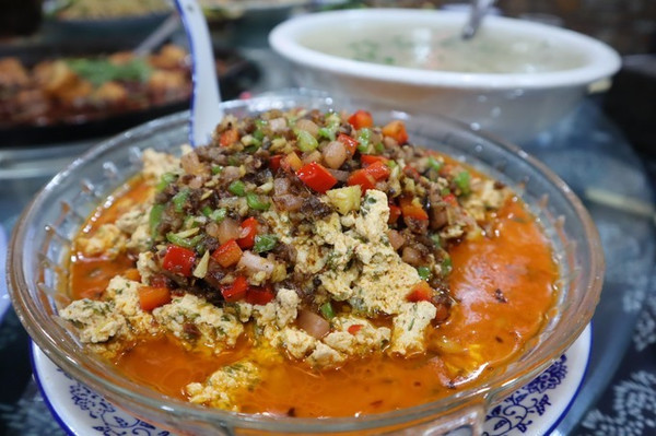 油渣菜豆腐、酸醡肉、香菜牛肉沫、灌海椒,这些都是典型的土家美食。 菜豆腐我就觉得沾辣椒酱很好吃。可能有些人吃不来我觉得我一点怪味酸味都没有,红色的辣椒酱太香了。