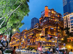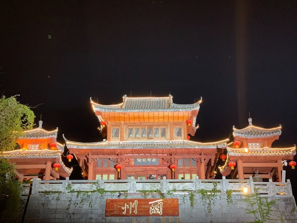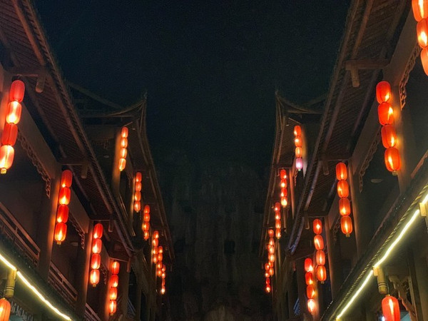 其实酉阳一下道就直接进入了酉阳桃花源的景区入口,旁边就是金灿灿的酉州古城。我觉得酉州古城还挺好看的,特别是夜晚,山路上坡地形,错落有致,建筑亮灯后立体感丰富。